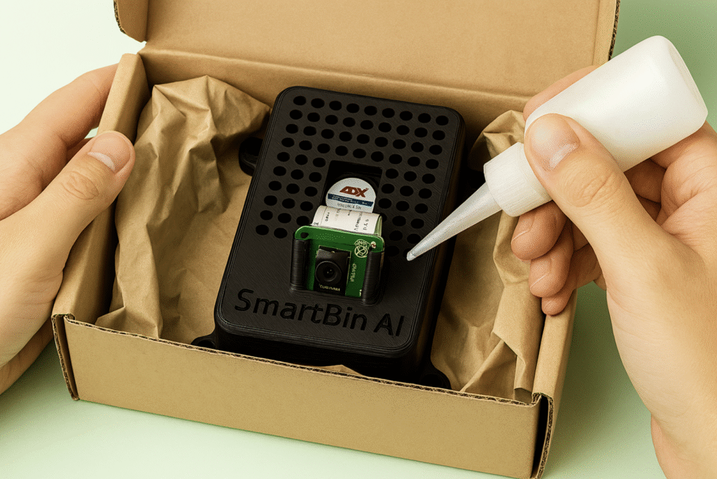 Please note, that there will be 2 separate components 3D printed, the lid containing the camera holder and the base. You are required to glue both modules together as illustrated in the image.